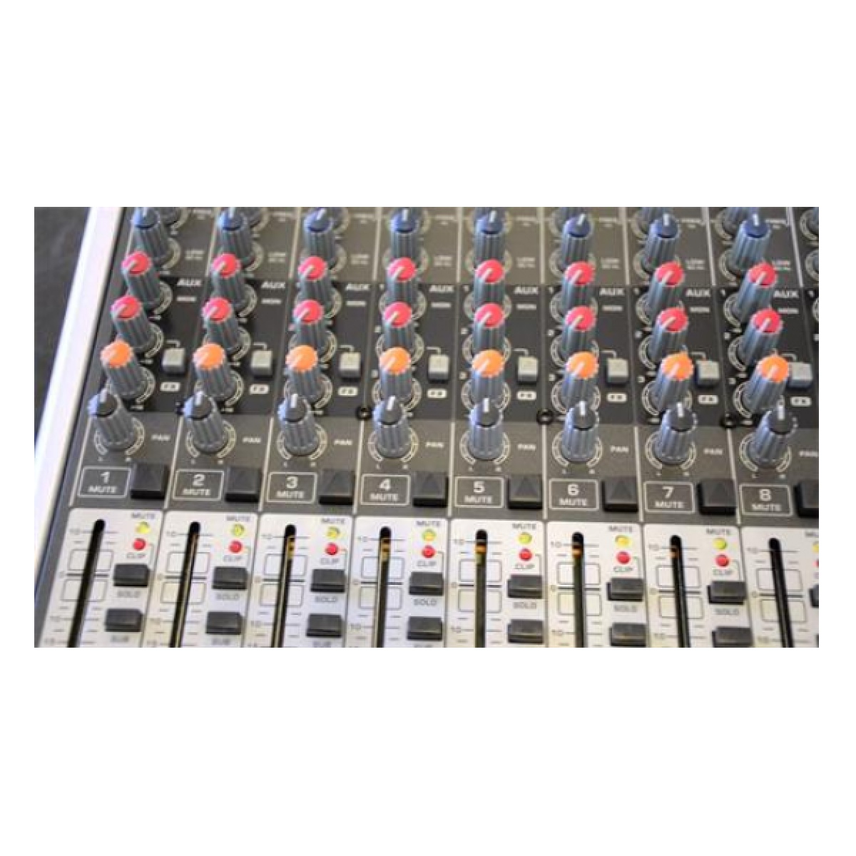 Clip LED, silenciar, mezcla principal y subgrupo enrutamiento conmutadores, solitario y funciones PFL en todos los canales