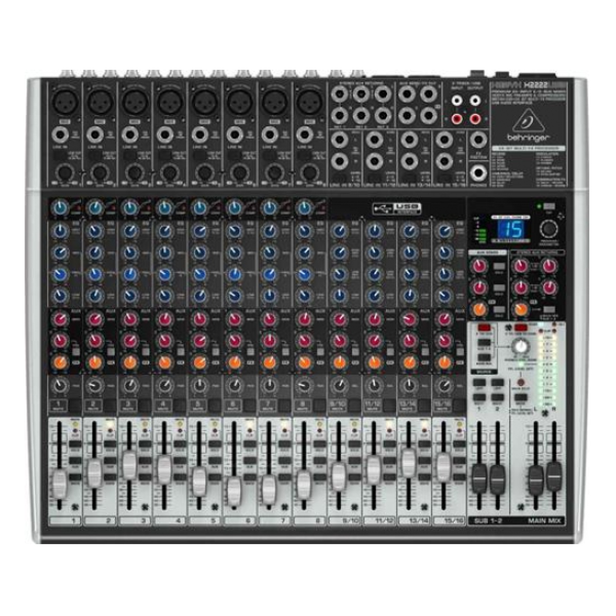 ¿Qué te parecería tener ocho canales de micrófono XENYX con inserciones, compresores dedicados, ecualizador de 3 bandas con mids semi-parametric y tres Aux sends Eso es lo que consigues con el X2222USB, además de cuatro canales estéreo de nivel de línea, dos subgrupos de mezclas y procamiento incorporado FX Digital de 24 bits, con controles de parámetro de usuario direccionable dobles. Todo esto y mucho más se encuentra en un chasis de acero listo para poner en el rack, y en marcha.