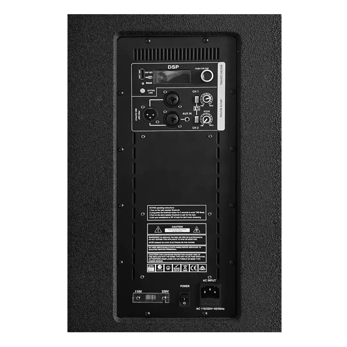 - Controles Versátiles: Incluye niveles principales, de micrófono y de línea, interruptor de encendido/apagado, y control DSP para ajustes precisos de sonido.